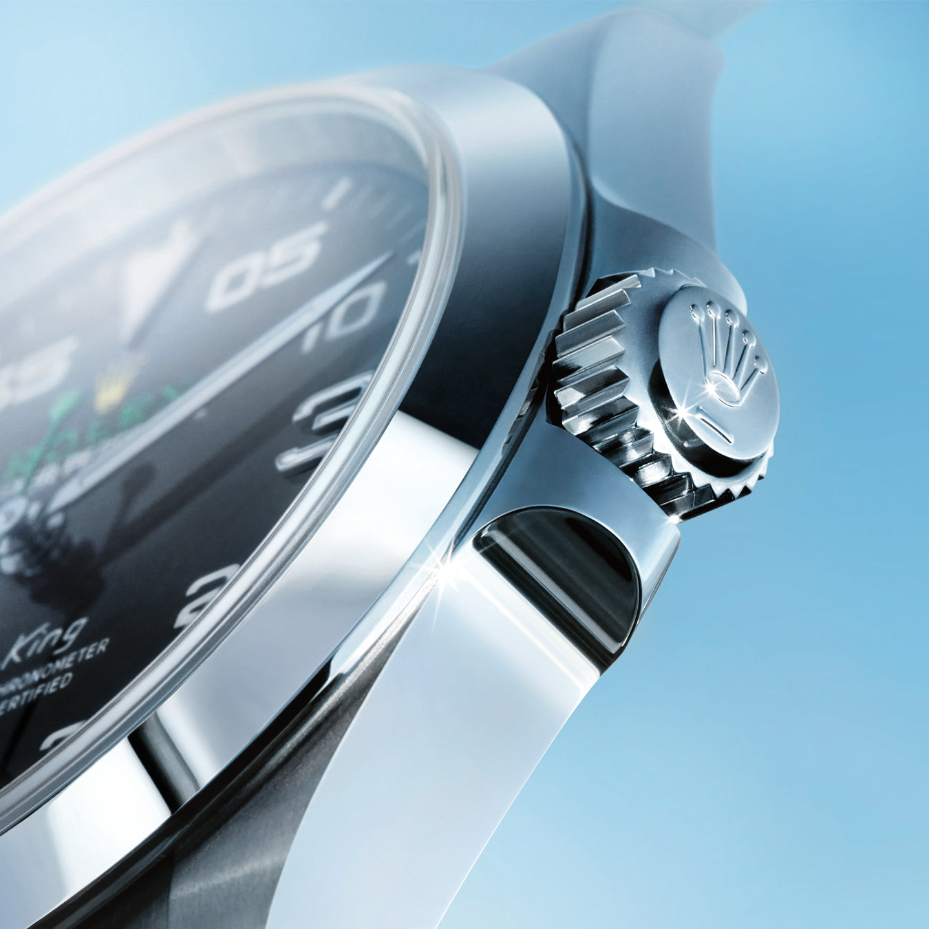 A paragon of robustness and reliability, the Air-King’s Oyster case is guaranteed waterproof to a depth of 100 metres (330 feet). The middle case is crafted from a solid block of Oystersteel, a particularly corrosion-resistant alloy.