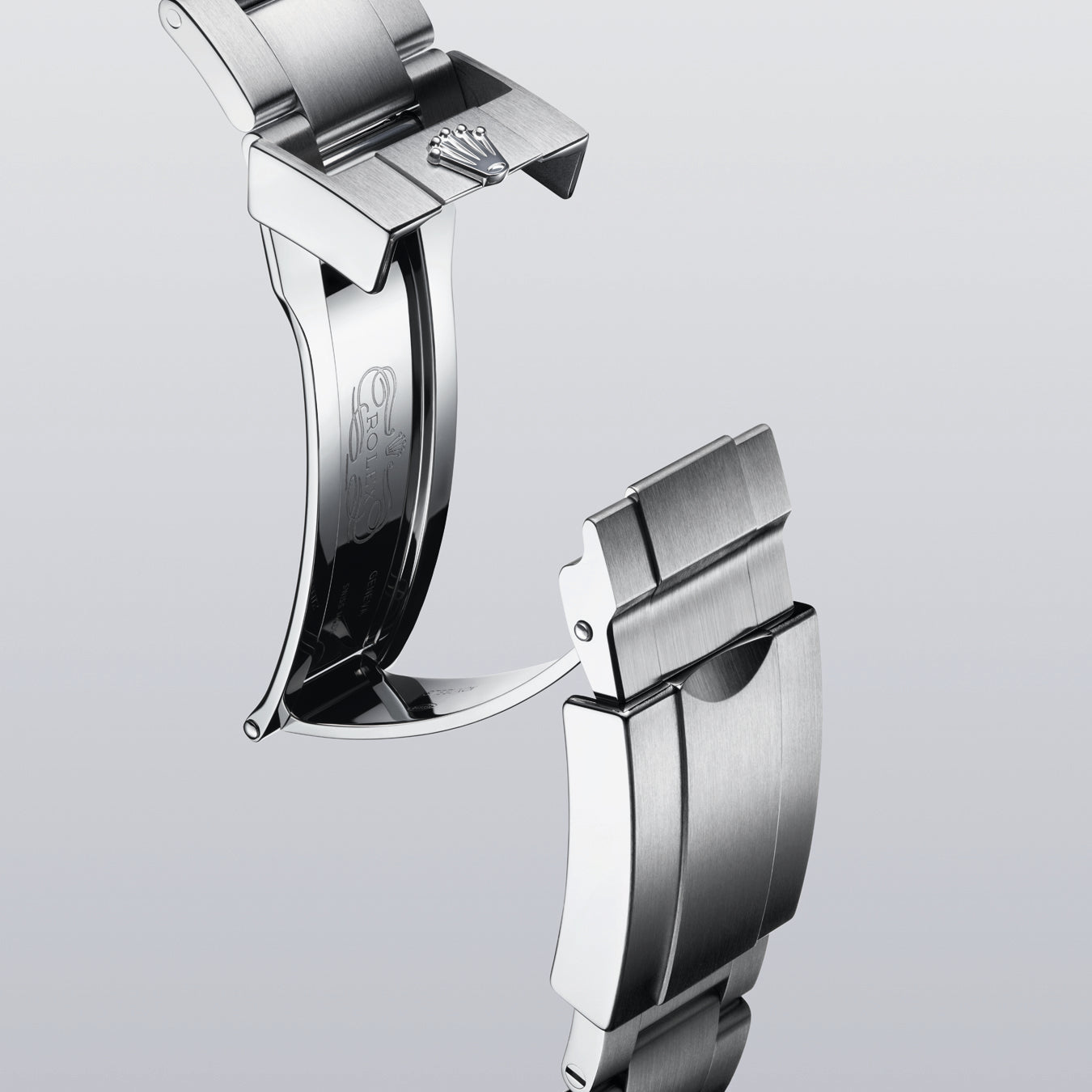 The Air-King is fitted on a three-piece link Oyster bracelet in Oystersteel. This bracelet is equipped with an Oysterlock safety clasp, designed by Rolex and patented, which prevents accidental opening. It is also fitted with the Easylink comfort extension link, which allows the wearer to adjust the bracelet length easily, by approximately 5 mm.