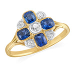 Antique Edwardian Yellow Gold Milgrain Edge Rub Set Rectangular Cut Sapphire and Old Cut Diamond Cluster Ring with Split Shoulders...