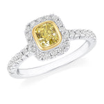 Platinum and 18ct Yellow Gold Rub Set Cushion Cut Natural Fancy Yellow Diamond and Round Brilliant Cut Diamond Halo Cluster...