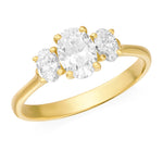 18ct Yellow Gold Three Stone Four Claw Set Oval Cut Diamond Ring with Tapered Shoulders