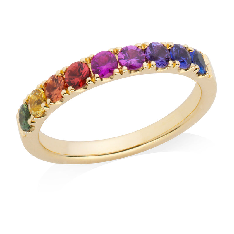 18ct Yellow Gold Four Claw Set Round Cut Rainbow Sapphire Half Eternity Ring