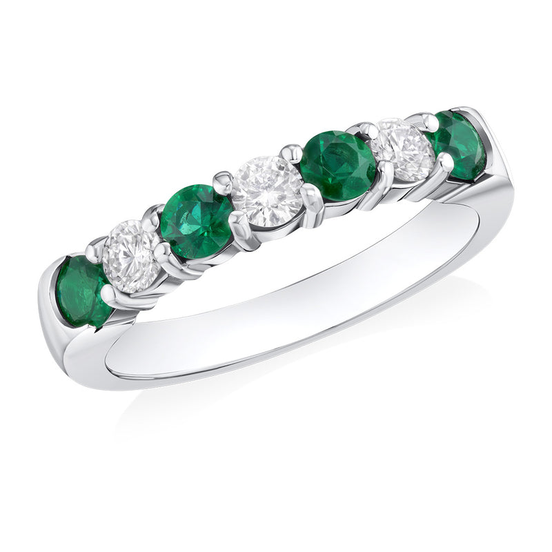 Platinum Four Claw Set Round Cut Emerald and Round Brilliant Cut Diamond Half Eternity Ring