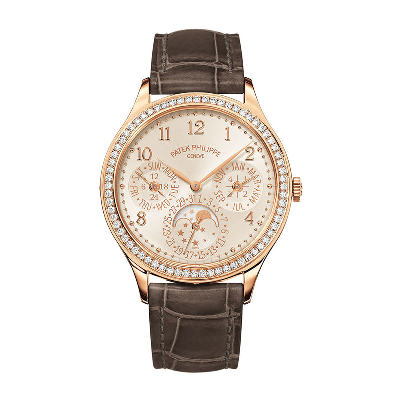 Patek Philippe Perpetual Calendar 18ct Rose Gold Silver Opaline Arabic Dial Watch with a Rose Gold Diamond Set Bezel on...