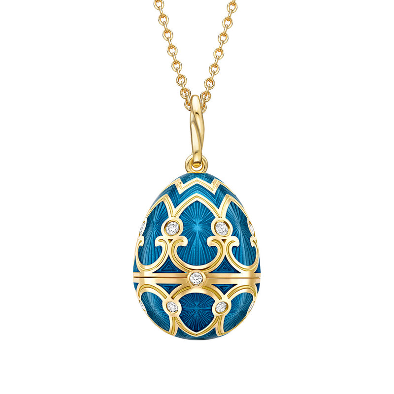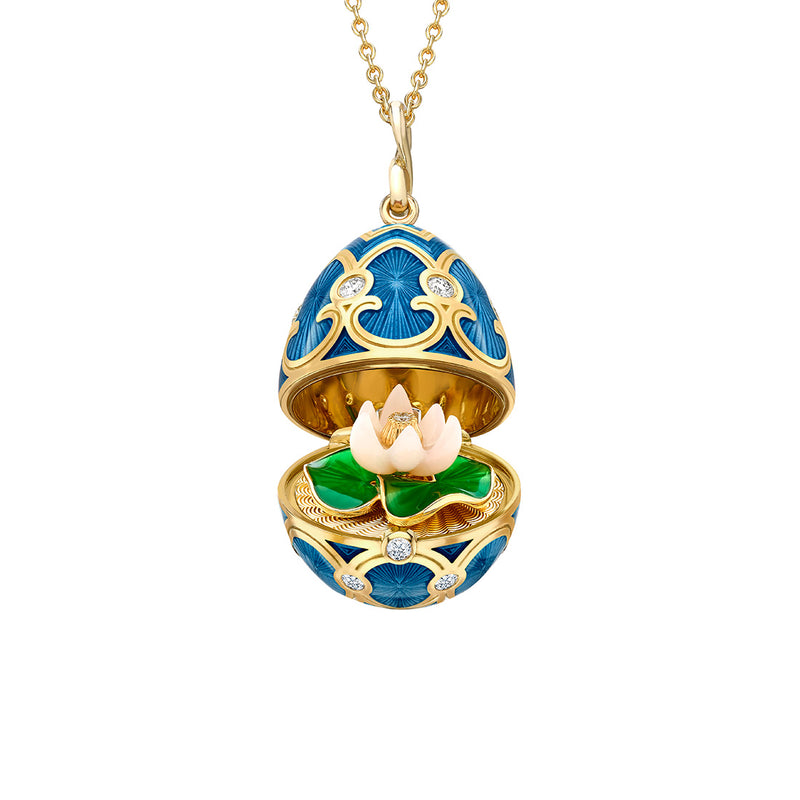 Fabergé Heritage 18ct Yellow Gold Blue Enamel Diamond and Mother of Pearl Water Lily Surprise Locket Pendant and Chain