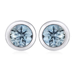 Platinum Rub Set Round Cut Aquamarine Stud Earrings with a Post and Scroll Fitting