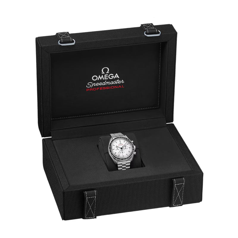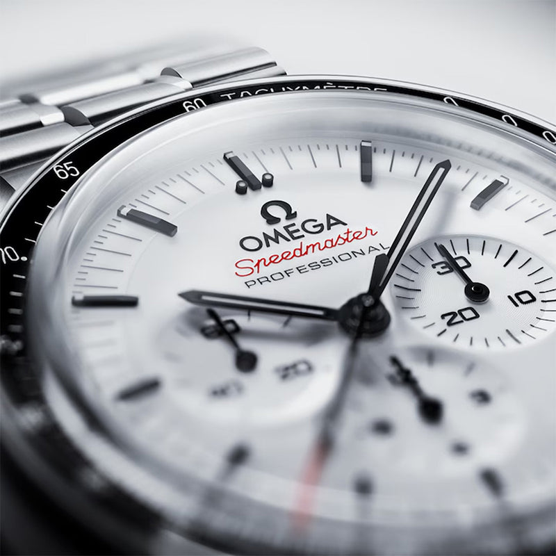 Omega Speedmaster Moonwatch Steel 42mm White Lacquered Baton Dial Watch with a Black Ceramic Tachymeter Bezel on a Brushed and...