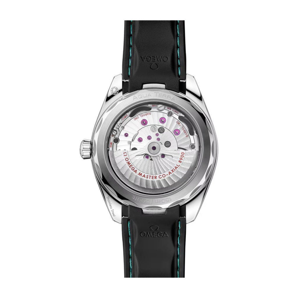 Omega Seamaster Aqua Terra 150M Steel 41mm Turquoise Baton Dial Watch with a Black Ceramic Bezel on a Black Rubber...