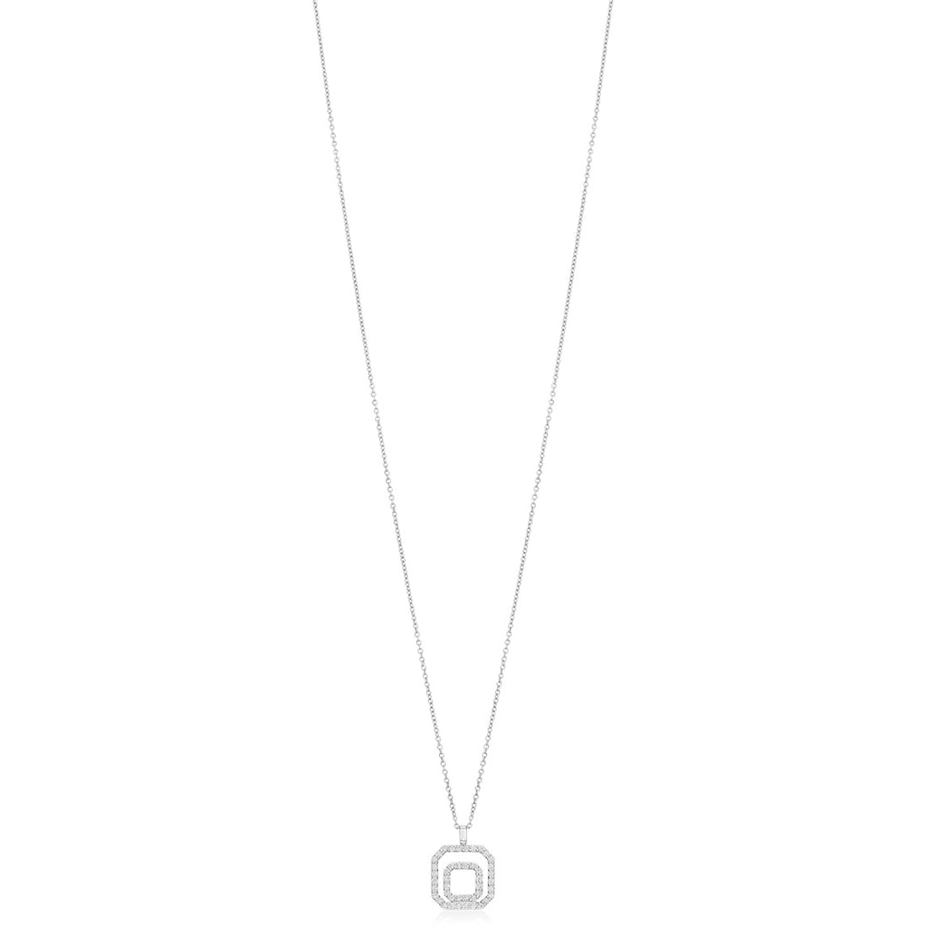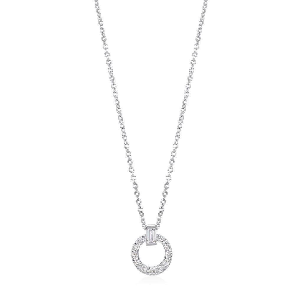 18ct White Gold Grain Set Round Brilliant Cut Diamond and Baguette Cut and Diamond Circular Pendant and Chain