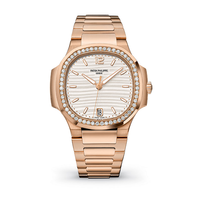 Patek Philippe Nautilus 18ct Rose Gold 35mm Silver Opaline Arabic and Baton Dial with a Rose Gold Diamond Set Bezel...