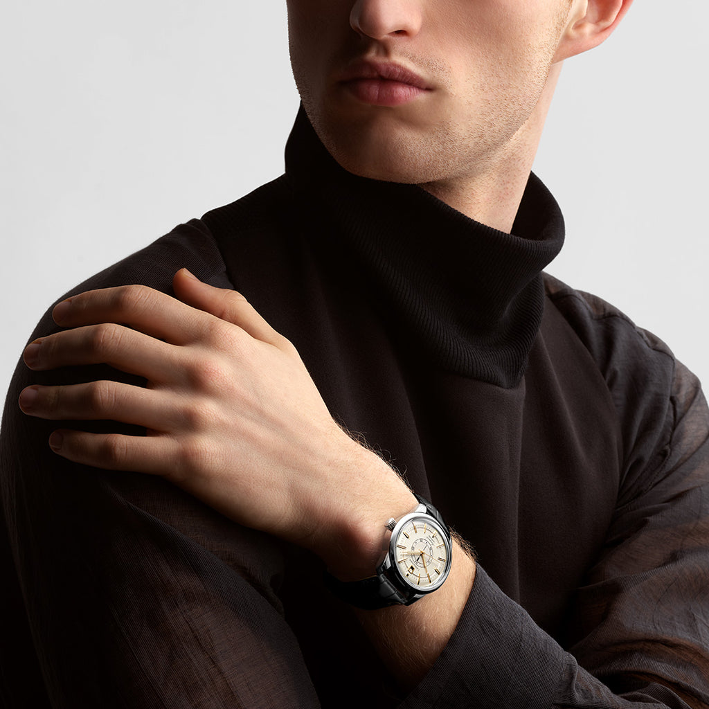 Longines Heritage Classic Conquest Heritage Steel 38mm Champagne Baton Dial Watch with a Steel Polished Bezel on a Black Alligator...