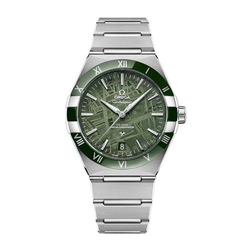 Omega Constellation Steel 41mm Green Baton Dial Watch with a Green Ceramic Bezel on a Brushed and Polished Steel Bracelet
