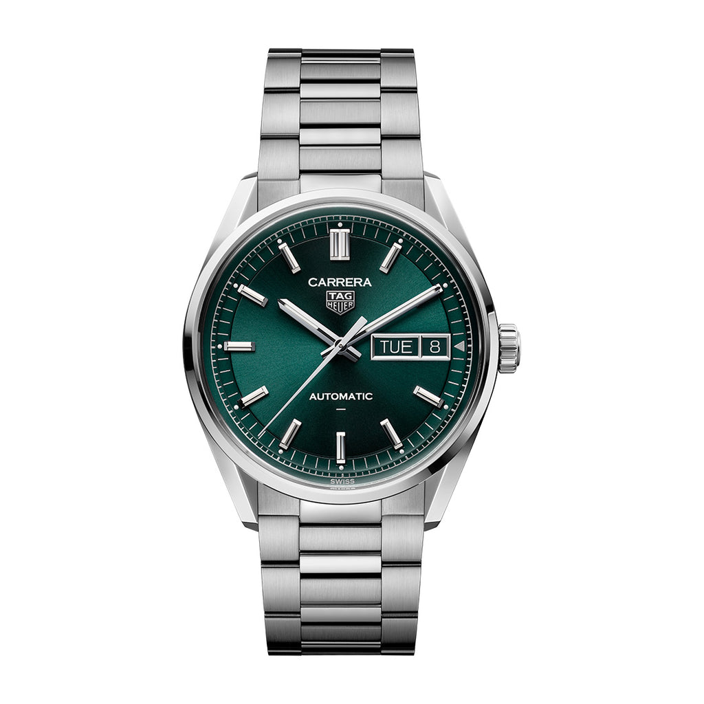 TAG Heuer Carrera Day-Date Steel 41mm Green Baton Dial Watch with a Steel Polished Bezel on a Steel Bracelet