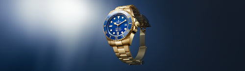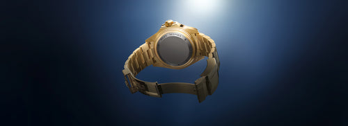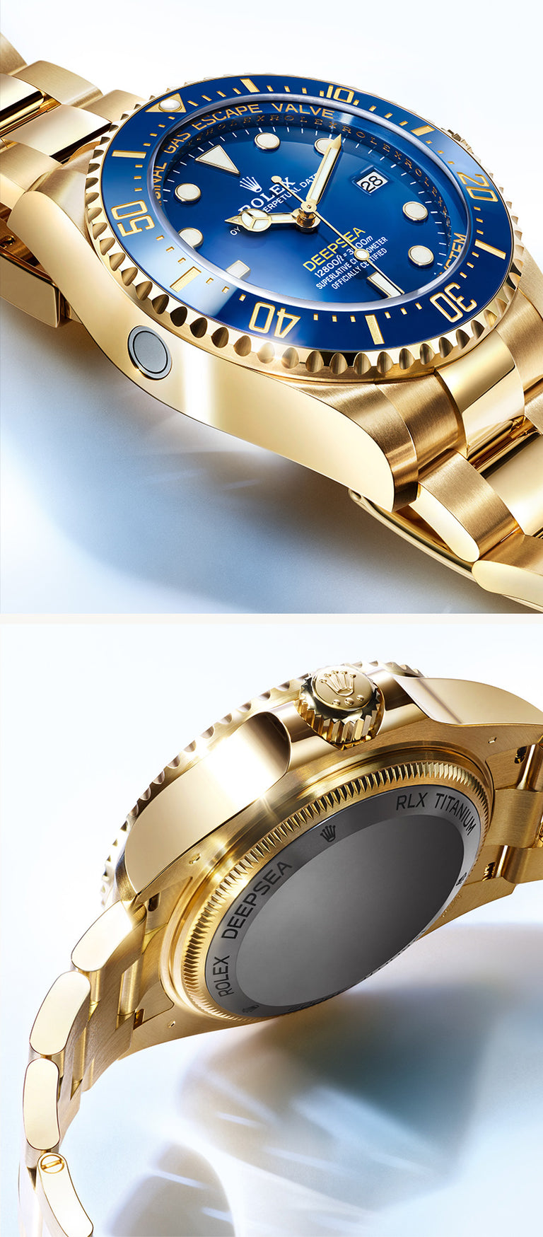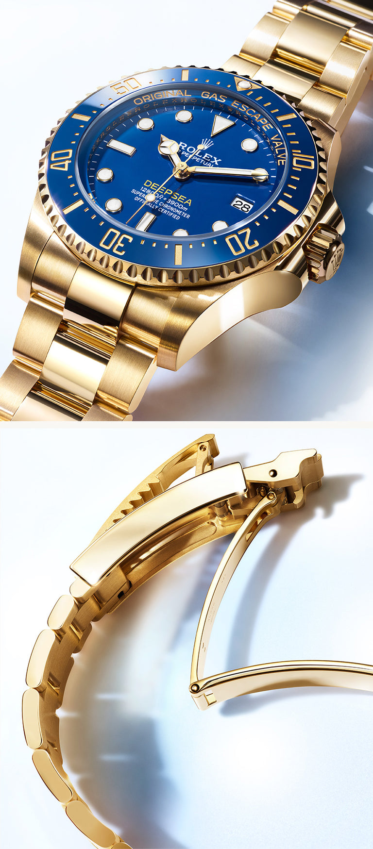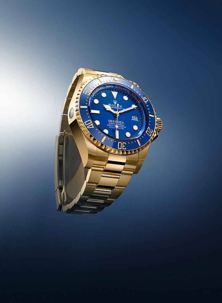 This divers’ watch is presented in 18 ct yellow gold for the first time and sports a 60-minute graduated Cerachrom bezel insert in blue ceramic as well as a blue lacquer dial bearing the name ‘DEEPSEA’ in powdered yellow.