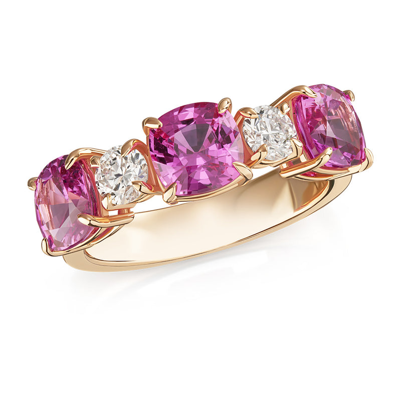 18ct Rose Gold Five Stone Four Claw Set Cushion Cut Pink Sapphire and Round Brilliant Cut Diamond Ring with Plain...