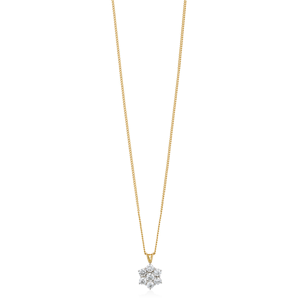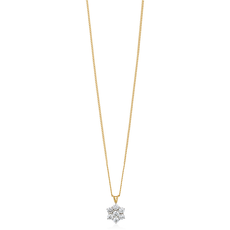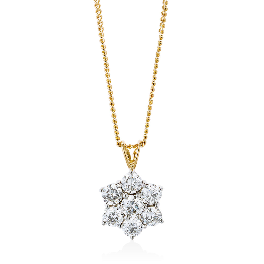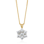 18ct White and Yellow Gold Claw Set Round Brilliant Cut Diamond Cluster Pendant and Chain
