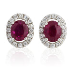 18ct White and Yellow Gold Four Claw Set Oval Cut Ruby and Round Brilliant Cut Diamond Halo Cluster Stud Earrings...