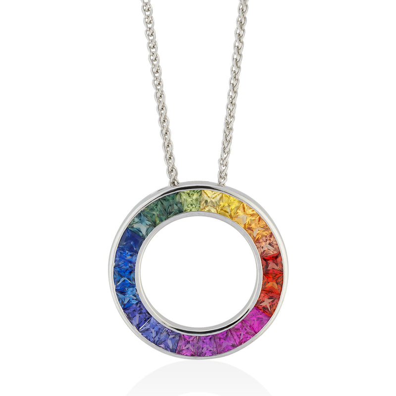 18ct White Gold Channel Set Calibre Princess Cut Rainbow Sapphire Circular Pendant and Chain