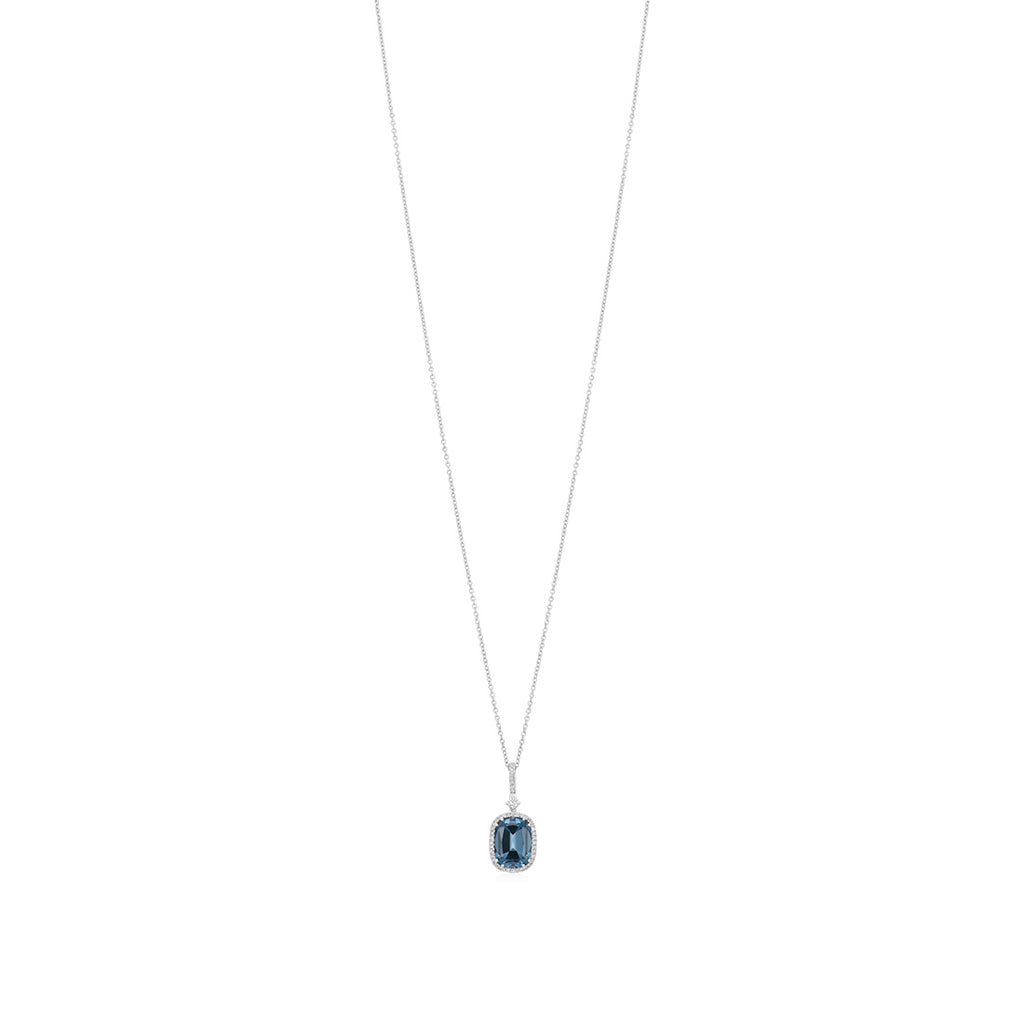 18ct White Gold Double Four Claw Set Long Cushion Cut London Blue Topaz and Round Brilliant Cut Diamond Halo Cluster...