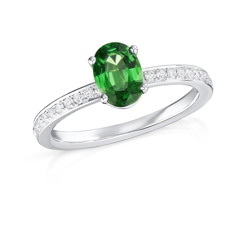 18ct White Gold Four Claw Set Oval Cut Tsavorite Ring with Diamond Grain Set Shoulders