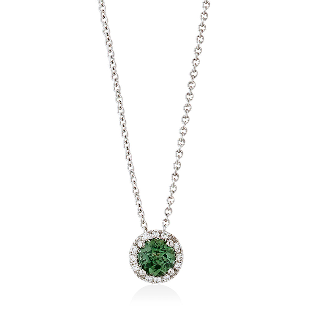 18ct White Gold Four Claw Set Round Cut Green Tourmaline and Round Brilliant Cut Diamond Halo Cluster Pendant and Chain...
