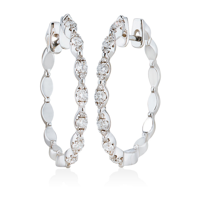 18ct White Gold Grain Set Round Brilliant Cut Diamond Hoop Earrings with a Post and Hinge Fitting