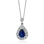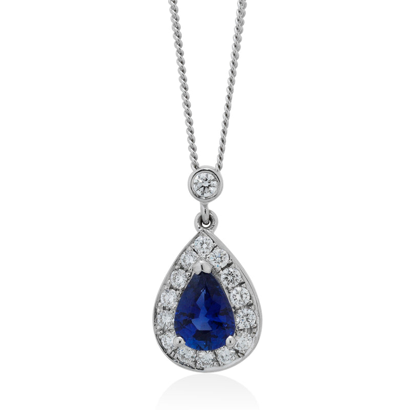 18ct White Gold Three Claw Set Pear Cut Sapphire and Round Brilliant Cut Diamond Halo Cluster Pendant and Chain