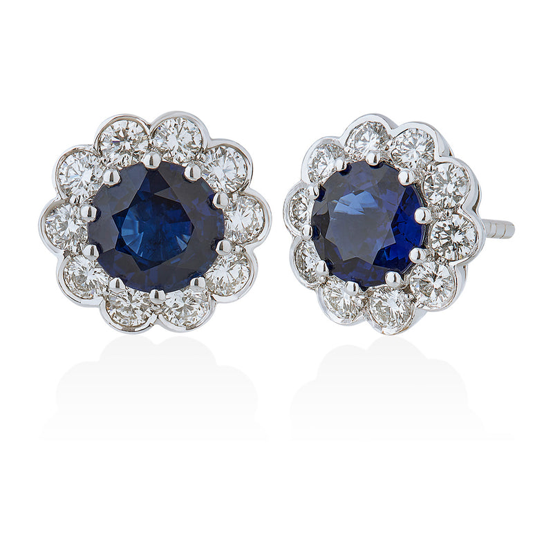 18ct White Gold Round Cut Sapphire and Round Brilliant Cut Diamond Cluster Stud Earrings with a Post and Scroll Fitting...