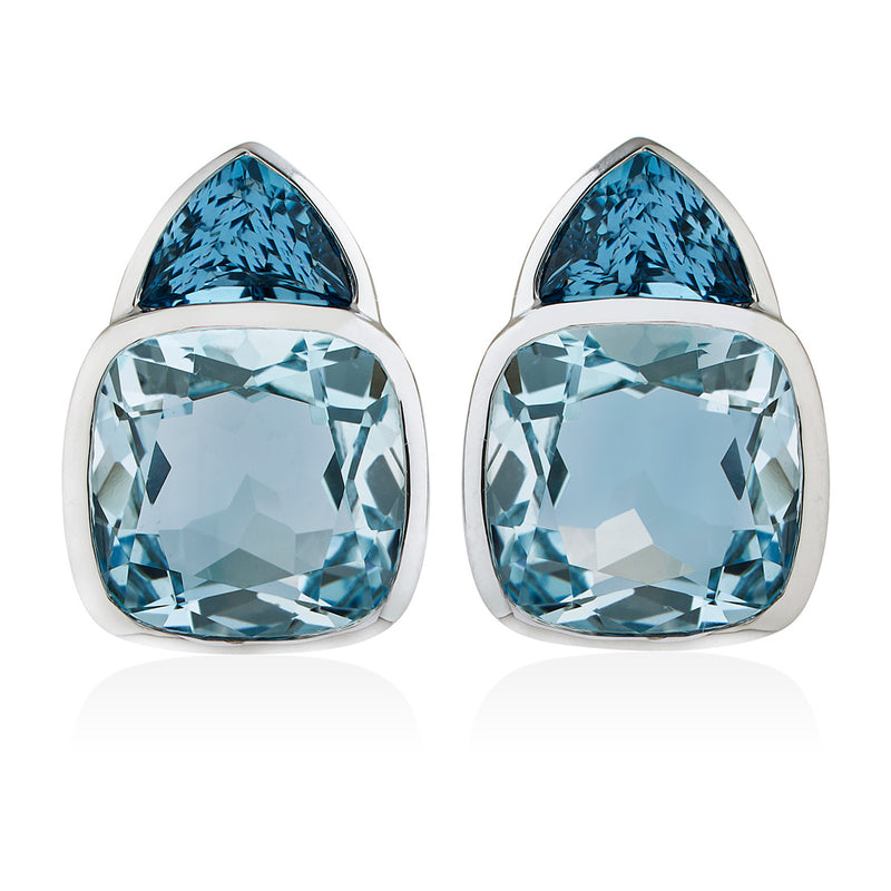 18ct White Gold Rub Set Cushion Cut Blue Topaz and Trapeze Cut London Blue Topaz Stud Earrings with a Post...
