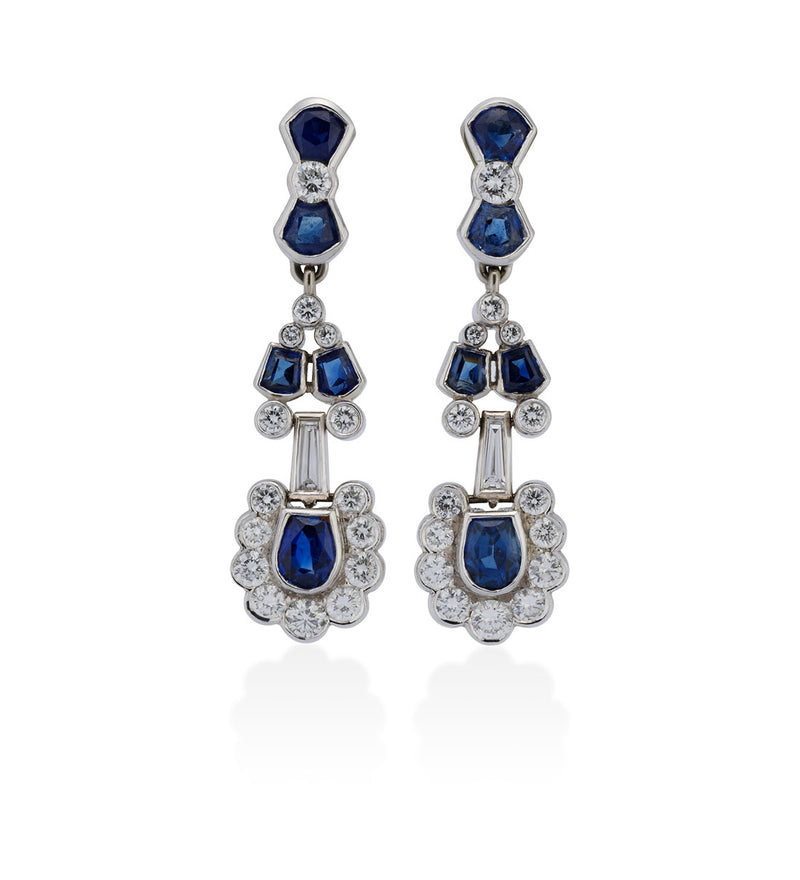 18ct White Gold Rub Set Mixed Cut Sapphire and Round Brilliant Cut Diamond Drop Earrings with a Post and Scroll...