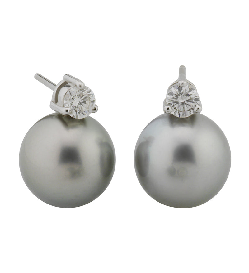18ct White Gold Tahitian Cultured Pearl and Round Brilliant Cut Diamond Stud Earrings with a Post and Scroll Fitting