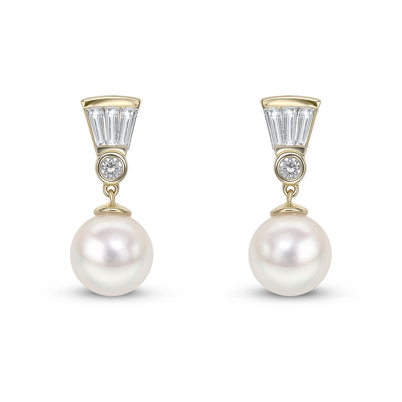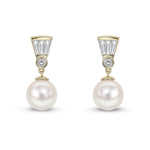 18ct Yellow Gold Akoya Cultured Pearl and Baguette Cut Diamond Drop Earrings with a Post and Scroll Fitting