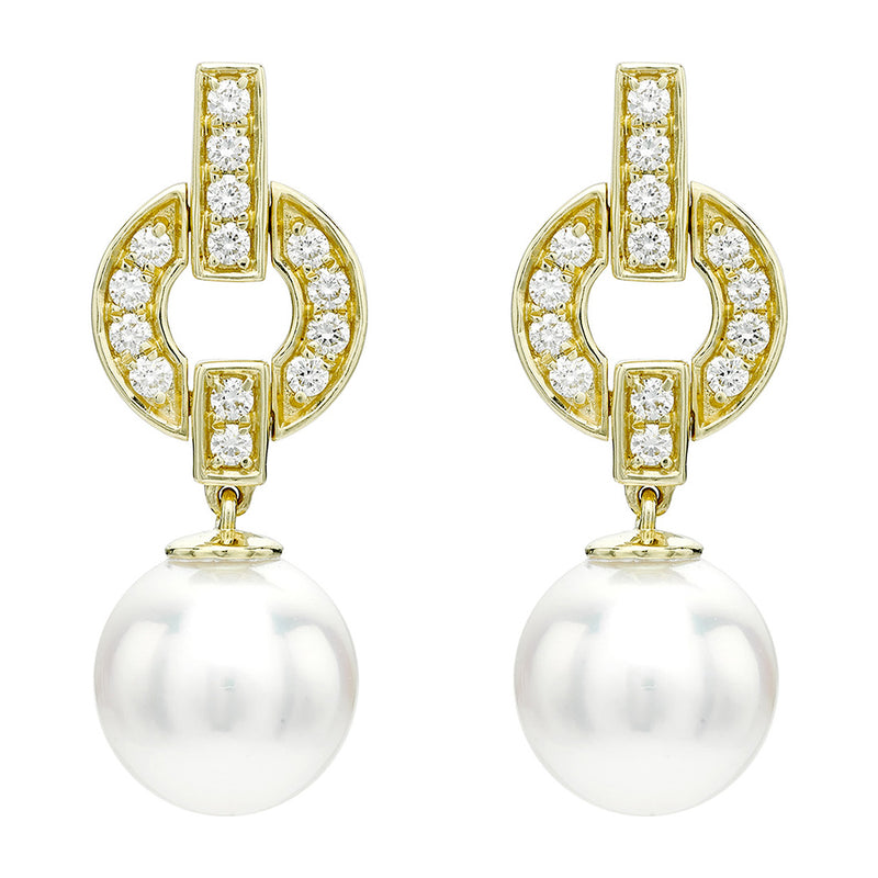 18ct Yellow Gold Akoya Cultured Pearl and Round Brilliant Cut Diamond Drop Earrings with a Post and Scroll Fitting