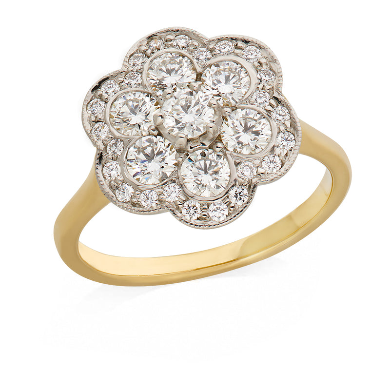 18ct Yellow Gold and Platinum Rub Set Round Brilliant Cut Diamond Floral Cluster Ring with Tapered Shoulders