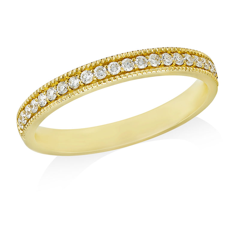 18ct Yellow Gold Polished Milgrain Edge Grain Set Round Brilliant Cut Diamond Flat Court Wedding Ring