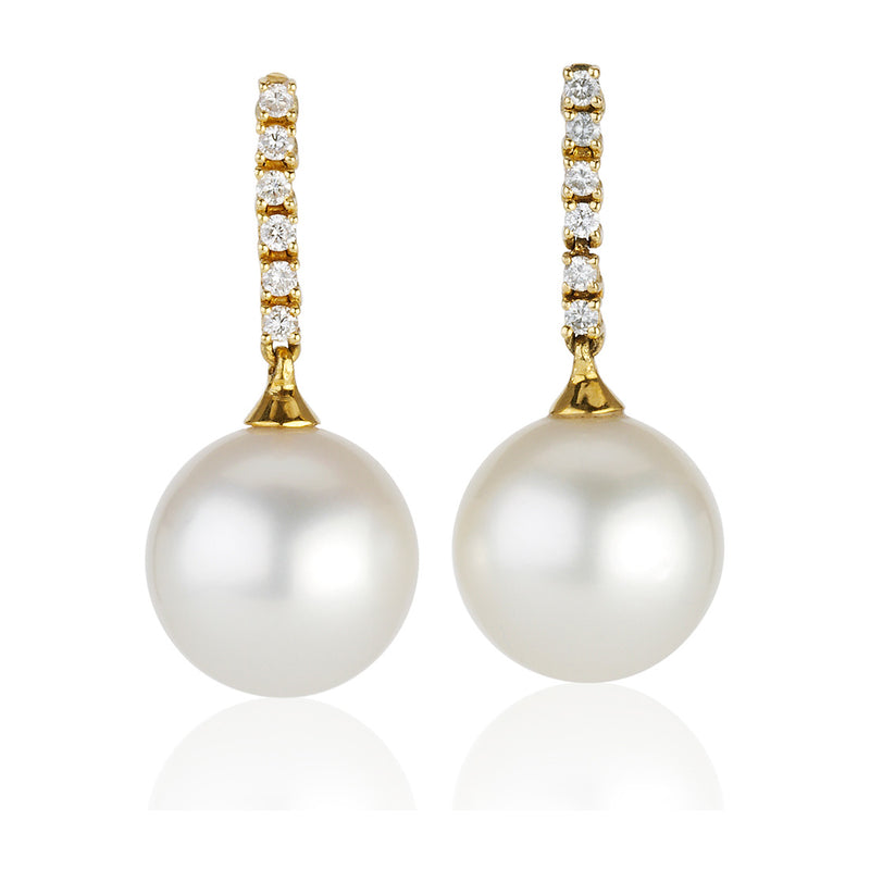 18ct Yellow Gold South Sea Cultured Pearl and Round Brilliant Cut Diamond Drop Earrings with a Post and Scroll Fitting...