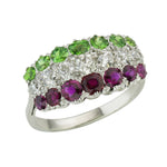 Antique Art Deco Platinum Triple Row Grain and Claw Set Old Cut Diamond, Ruby and Garnet Ring with Plain Shoulders...