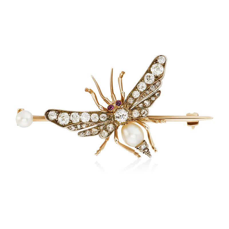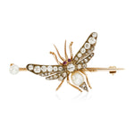 Antique Victorian Yellow Gold Diamond, Pearl and Ruby Insect Brooch
