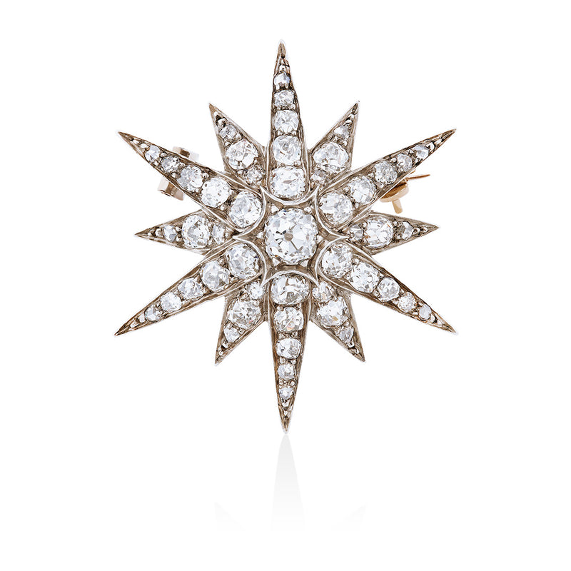 Antique Victorian Yellow Gold and Silver Grain Set Old Cut Diamond and Rose Cut Diamond Star Brooch