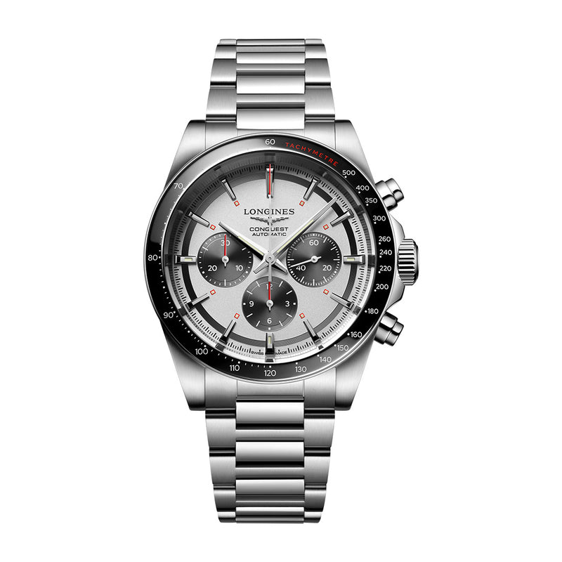 Longines Conquest Steel 42mm Silver Luminous Marker Dial Watch with a Black Ceramic Bezel on a Steel Bracelet