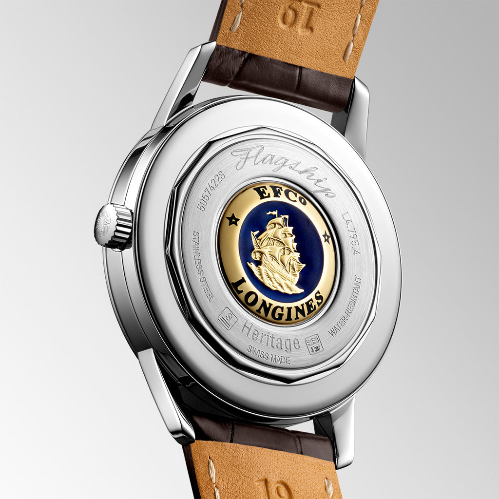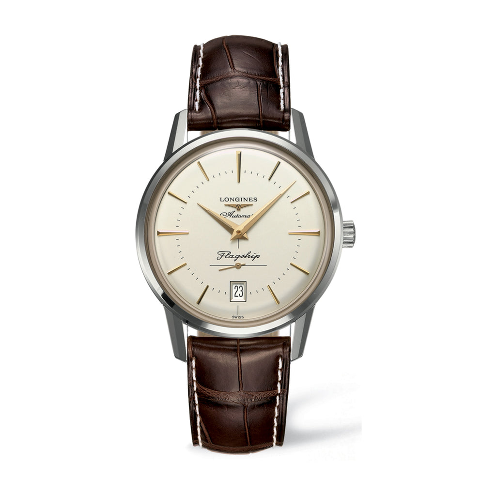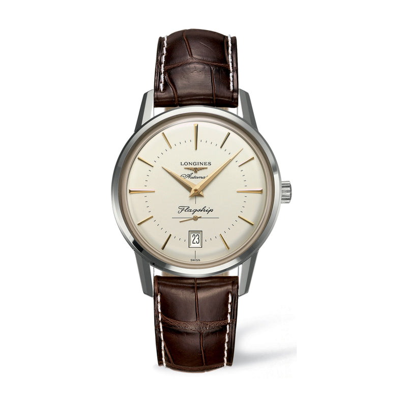 Longines Flagship Heritage Steel 38.5mm Silver Baton Dial Watch with a Steel Polished Bezel on a Brown Alligator Strap