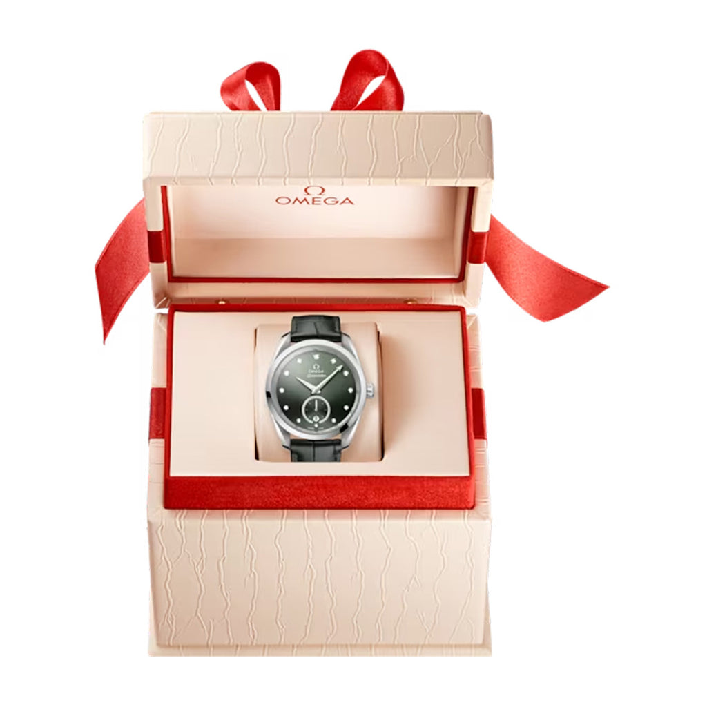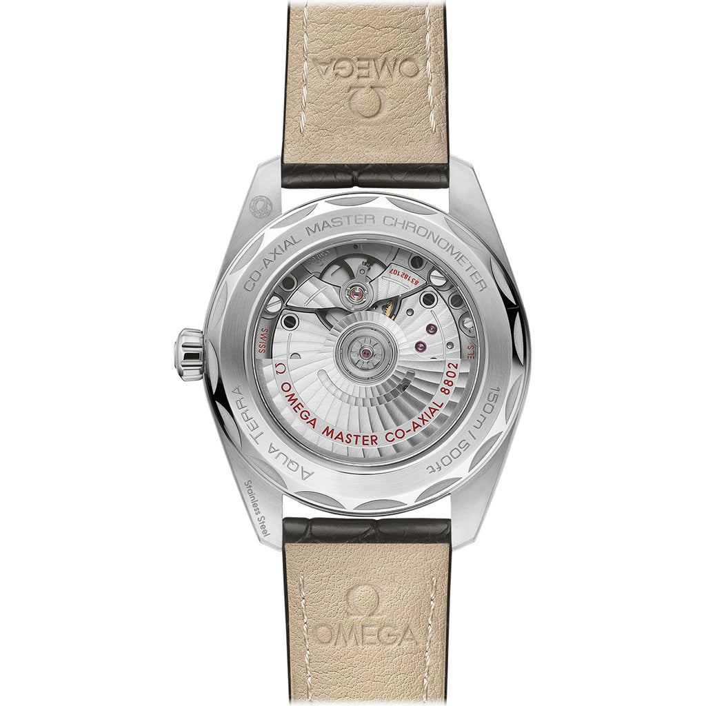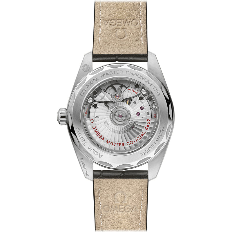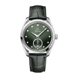 Omega Seamaster Aqua Terra 150M Steel Green Sunbrushed Diamond Dot Dial Watch with a Steel Bezel on a Black Leather...