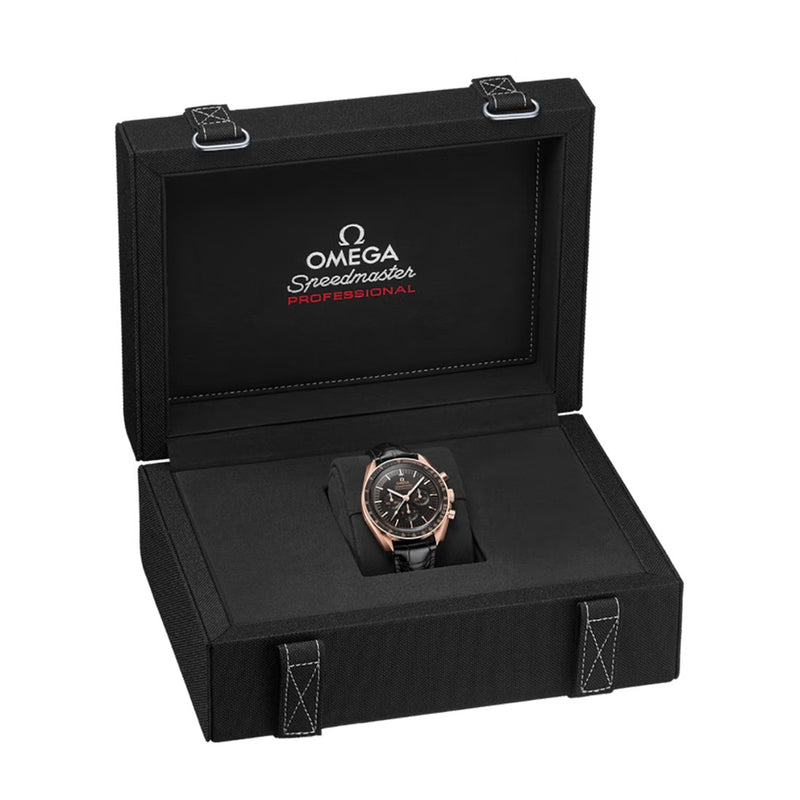 Omega Speedmaster Moonwatch 18ct Rose Gold Black Baton Dial Watch with a Black Aluminum Tachymeter Bezel on a Black Alligator...