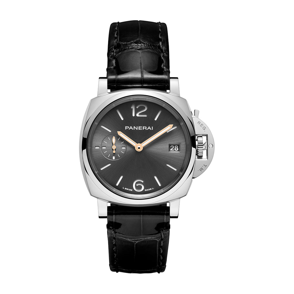 Panerai Luminor Due Steel 38mm Black Baton Dial Watch with a Steel Polished Bezel on a Black Alligator Strap