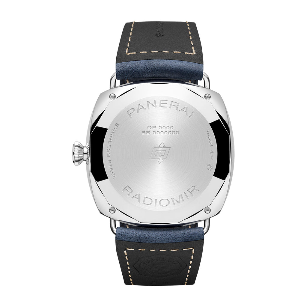 Panerai Radiomir Officine Steel 45mm Blue Sunbrushed Arabic and Baton Dial Watch with a Steel Polished Bezel on a Blue...