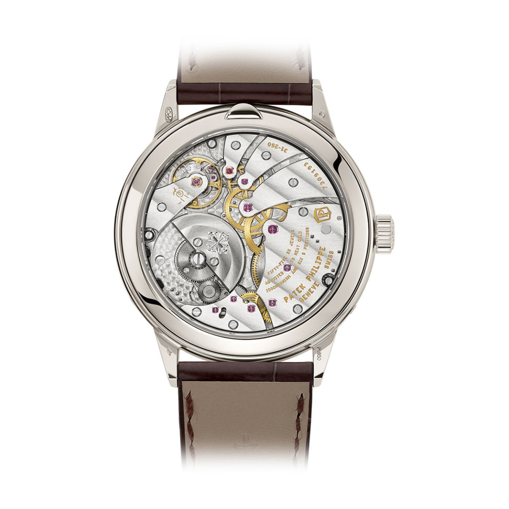 Patek Philippe Grand Complications Perpetual Calendar Platinum Rose-gilt Baton Dial Watch with a Platinum Polished Bezel on a Chocolate Brown...