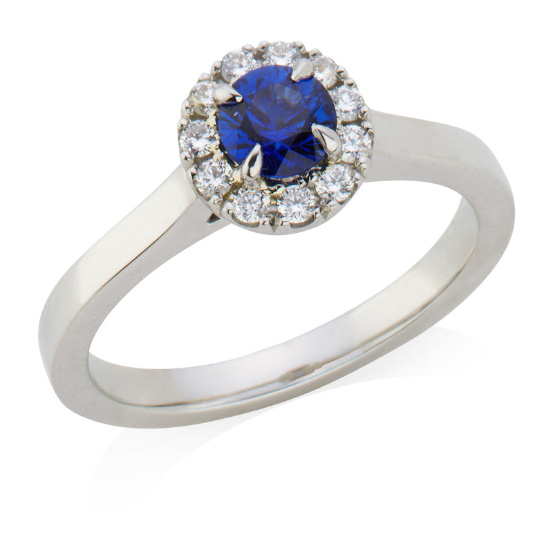 Platinum Four Claw Set Round Cut Sapphire and Round Brilliant Cut Diamond Halo Cluster Ring with Plain Shoulders