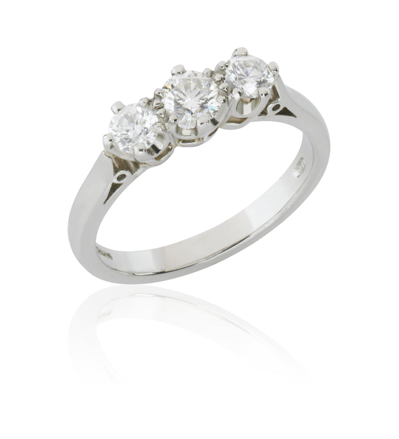 Platinum Three Stone Claw Set Round Brilliant Cut Diamond Ring with Chenier Shoulders