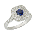 Pre-Owned Platinum Four Claw Set Cushion Cut Sapphire and Round Brilliant Cut Diamond Double Halo Cluster Ring
