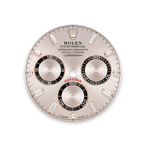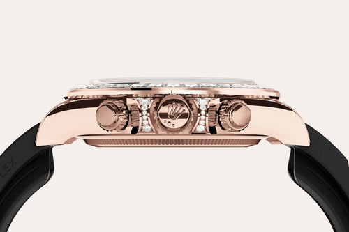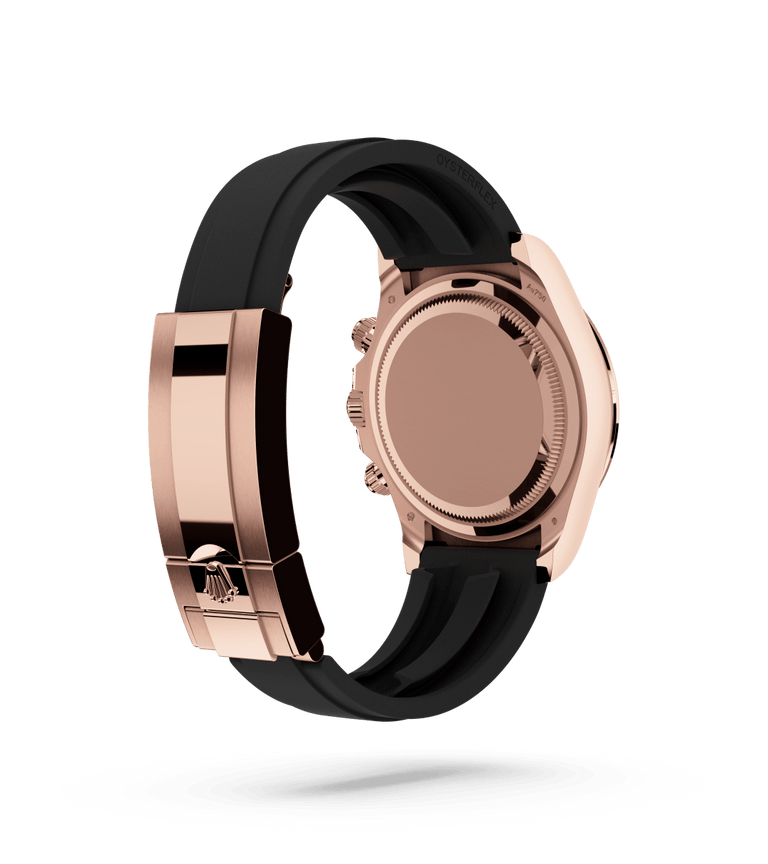 The 18 ct gold versions of the Cosmograph Daytona with a Cerachrom bezel are available with an Oysterflex bracelet. Developed by Rolex and patented, it singularly combines the robustness of a metal bracelet with the comfort of an elastomer bracelet. It is made up of two flexible curved metal blades – one in each bracelet section – overmoulded with high-performance black elastomer. For optimum comfort, the Oysterflex bracelet is equipped with cushions on its inner sides and an Oysterlock safety clasp to prevent accidental opening. Its length may be adjusted via the ingenious Rolex Glidelock extension system.